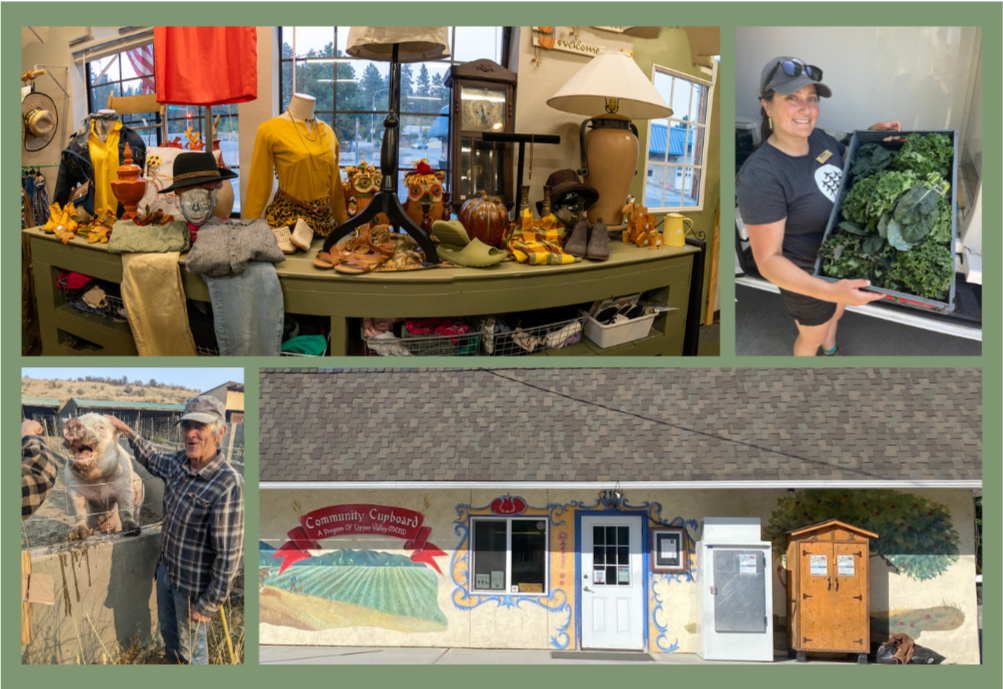 The community reduces waste through MEND in a number of ways, including those represented here. Clockwise from top left: Das Thrift gives used goods and clothing a second chance; former gleaning coordinator and new food systems coordinator Alana Springer gleans extra produce from the Wenatchee Farmers Market; Steve Scott from Gau-Sco Farm in Malaga is one of many farmers who take food waste from the Community Cupboard to feed their livestock; the Cupboard has a refrigerator and cupboard outside the door to make food that's about to expire available for anyone who needs it.